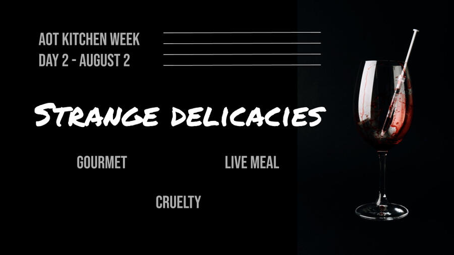 Though we've previously hosted a dead dove Eremin week on this account, creations for AOT Kitchen Week don't have to be limited to Eremin—ships and interpretations ranging from tooth-rottingly fluffy to indulgently problematic are welcome. We encourage you to explore your dead dove palate, pun intended! And to clarify, ship content is not required, creators can focus on one character or explore platonic bonds if they wish!